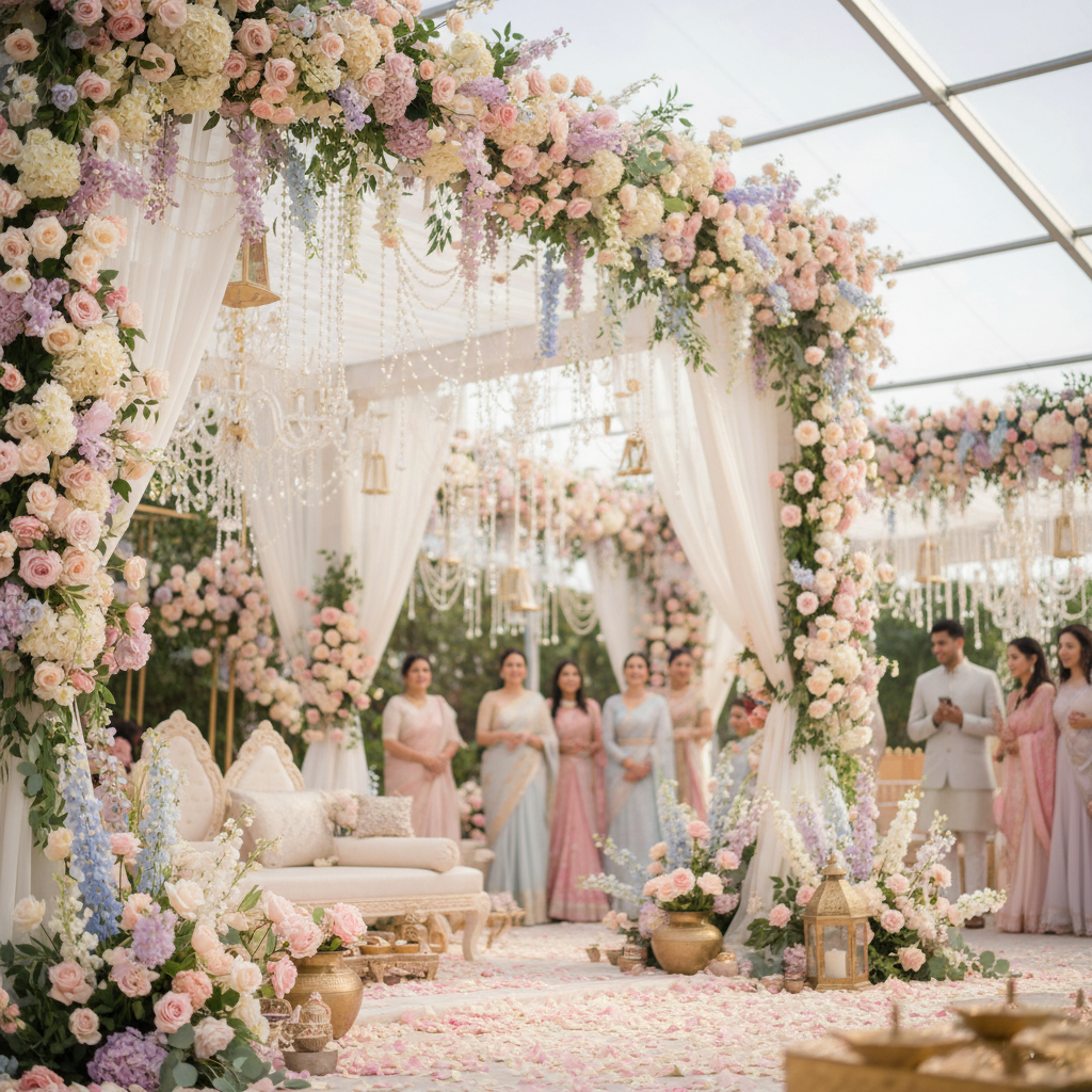 We design mandap & stage florals, bridal bouquets, table centerpieces, entrance décor, hanging installations, and event-specific floral setups for Haldi, Mehndi, and Reception.