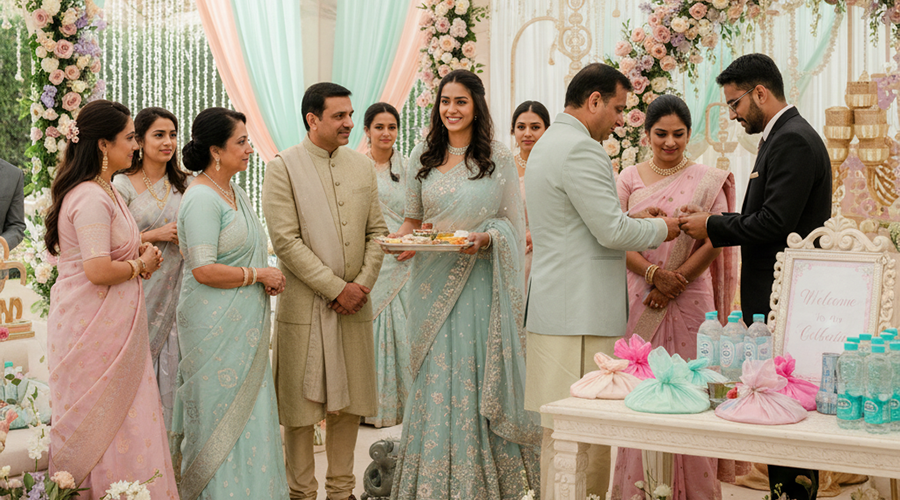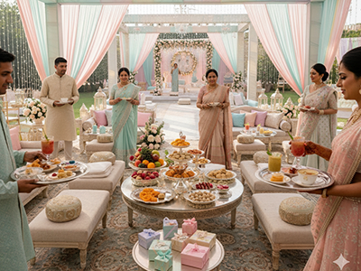 Guest hospitality covers everything from welcoming guests, travel assistance, hotel check-ins, personalized welcome kits, and on-ground support to ensure they feel comfortable and cared for during the wedding celebrations.