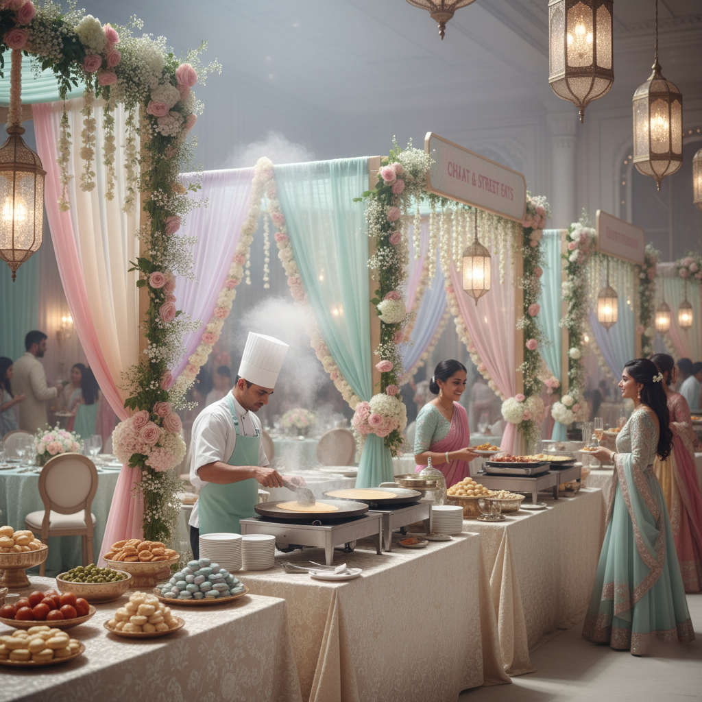 We offer a wide variety including chaat stalls, tandoor grills, South Indian counters, pasta & Oriental stations, dim sum, dessert bars, and more.