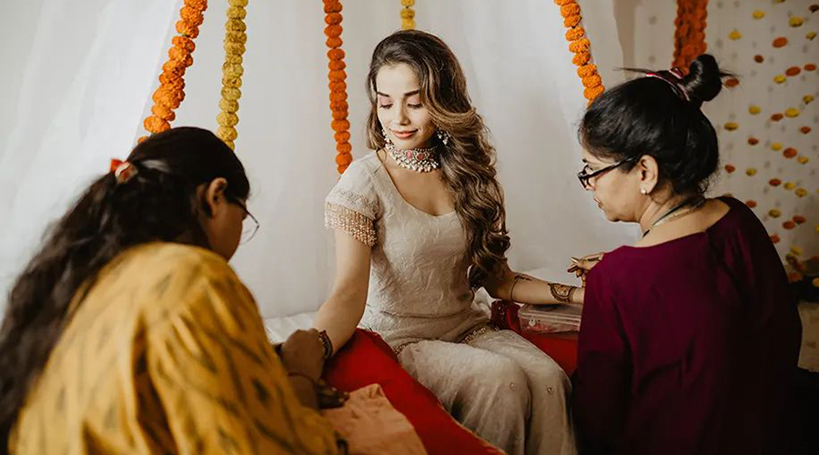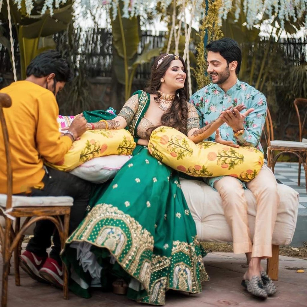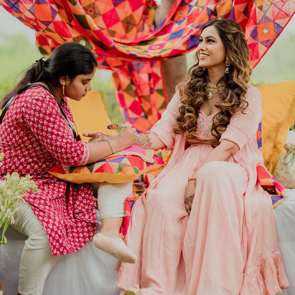 Yes, we can set up a beautifully decorated mehndi station or lounge to enhance the festive vibe and give guests a comfortable space to enjoy the experience.
